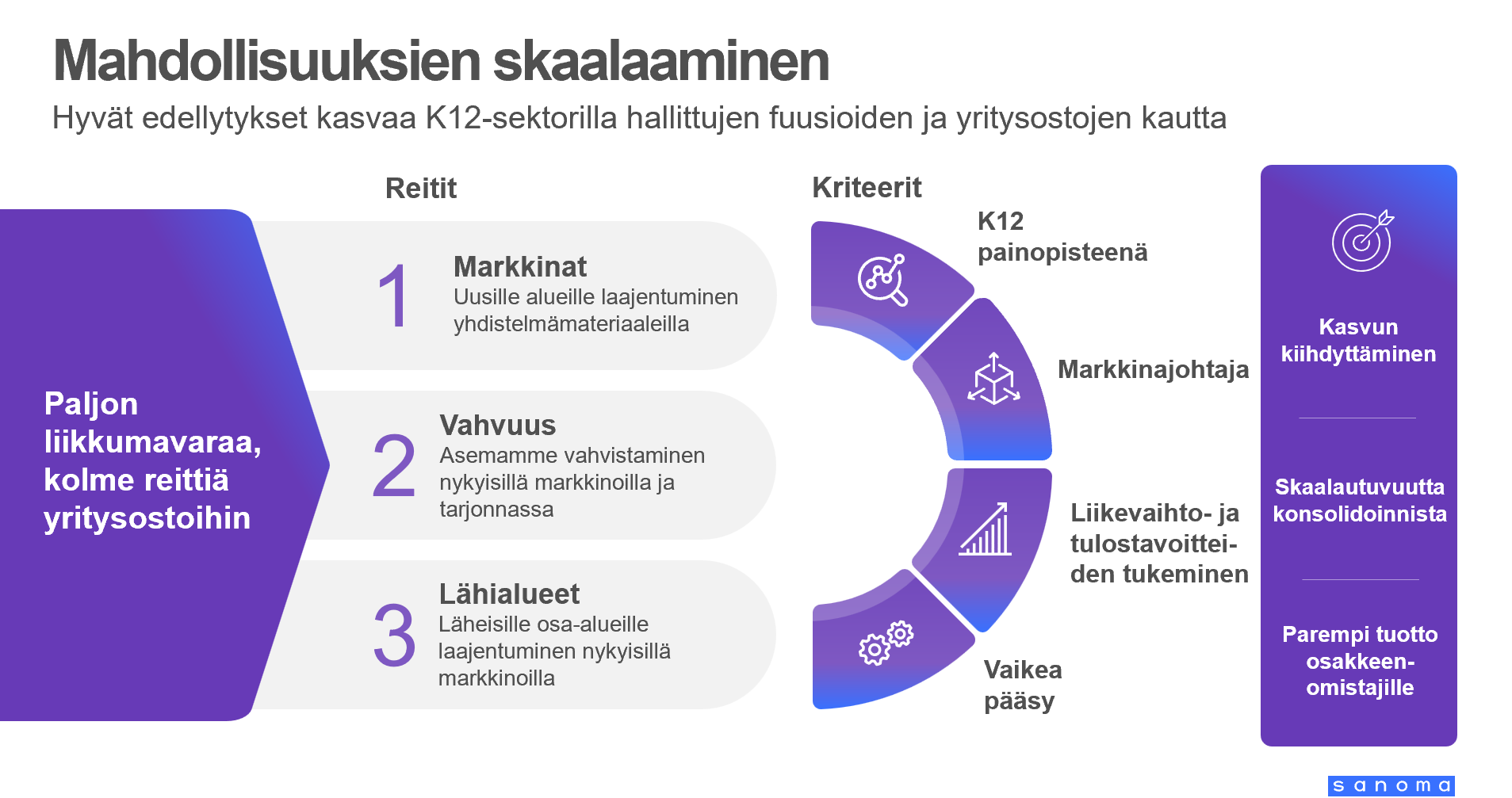 Oppimisen tuotteemme ja palvelumme auttavat opettajia kehittämään lasten taitoja niin, että jokainen saavuttaisi parhaat mahdolliset oppimistulokset. Tarjoamme painettuja ja digitaalisia oppimateriaaleja sekä digitaalisia oppimis- ja opetusalustoja ala- ja yläkouluihin sekä toiselle asteelle. Haluamme kasvattaa liiketoimintaamme orgaanisesti sekä pienemmillä yritysostoilla nykyisissä toimintamaissamme.